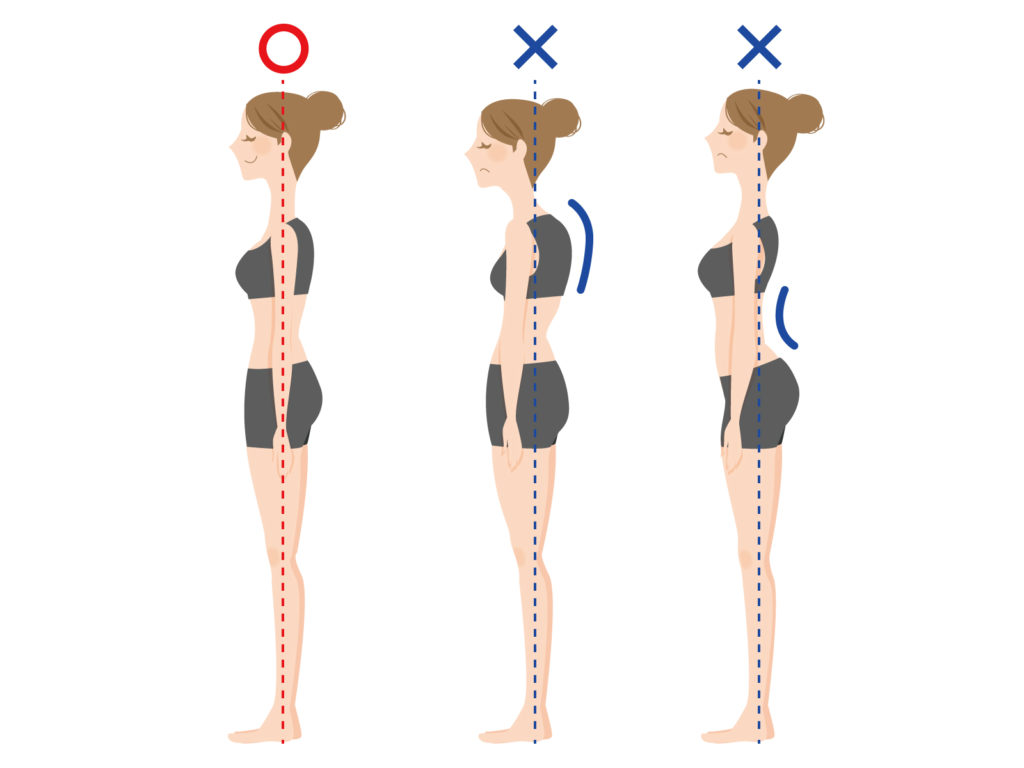 真横から見た時は、耳たぶ・肩峰(肩の出っ張った部分)・大転子(足の付け根の出っ張った部分)・膝・外くるぶしが一直線になるのが良いと言われています。